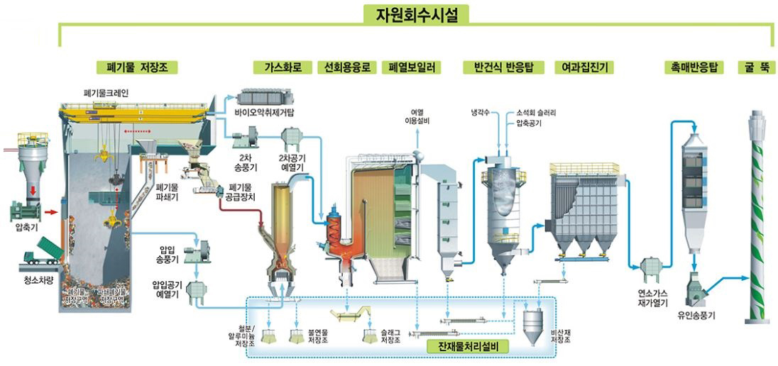 소각열은 폐열보일러를 통해 열을 회수하여 지역난방 에너지로 활용되고, 용융슬래그는 건설자재로 재활용됩니다.