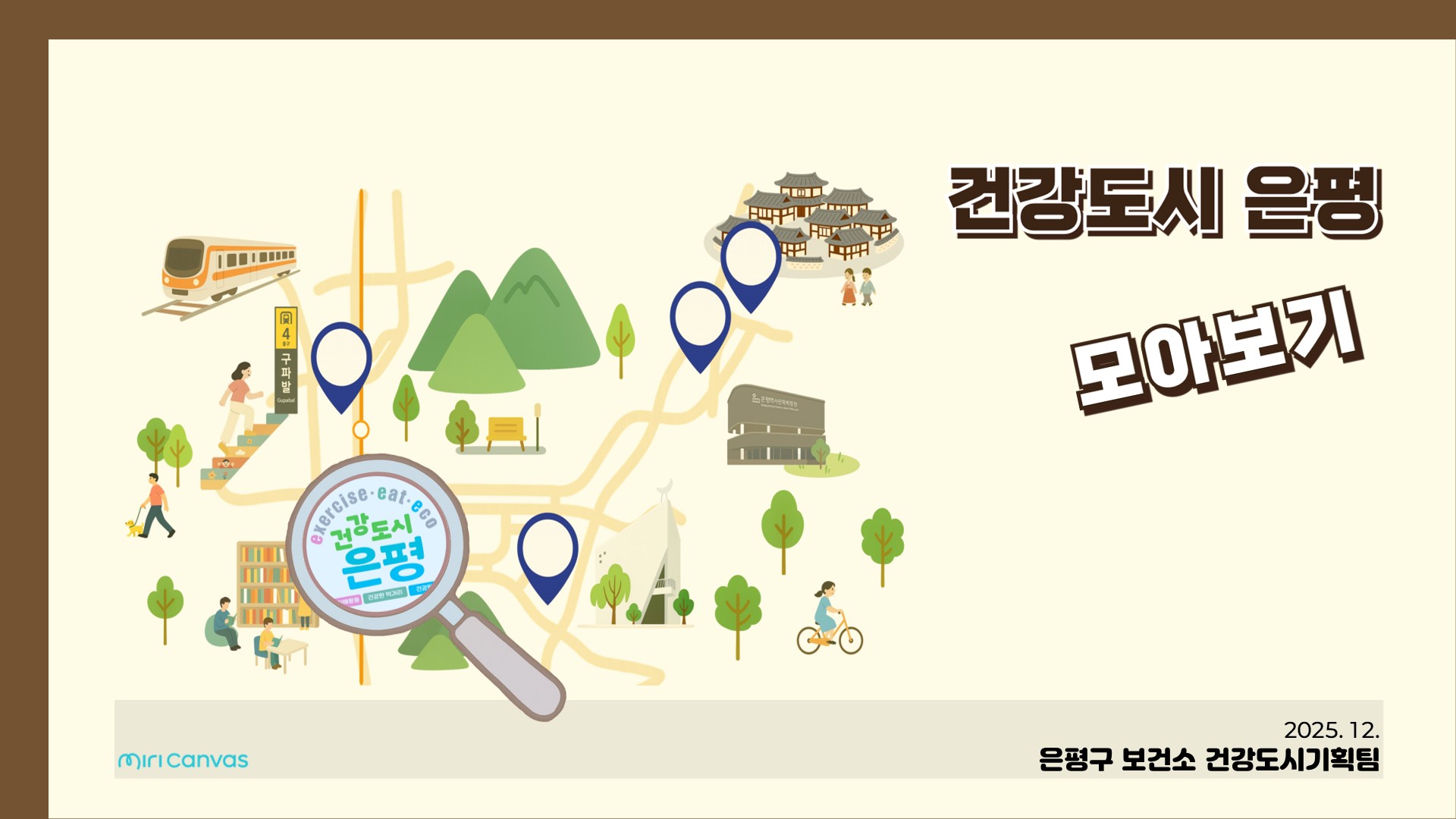 1. 신체활동 - 걷기 실천율, 중등도 이상 신체활동 실천율 - 생애주기별 신체활동 지침 - 관내 체육시설 및 공원 현황 2. 보건기관 및 의료기관 - 관내 보건기관 및 주요 의료기관, 공공 심야약국 3. 먹거리 - 모범음식점 현황 - 대규모 점포 및 전통시장 - 음식점 위생등급제 지정현황 |
