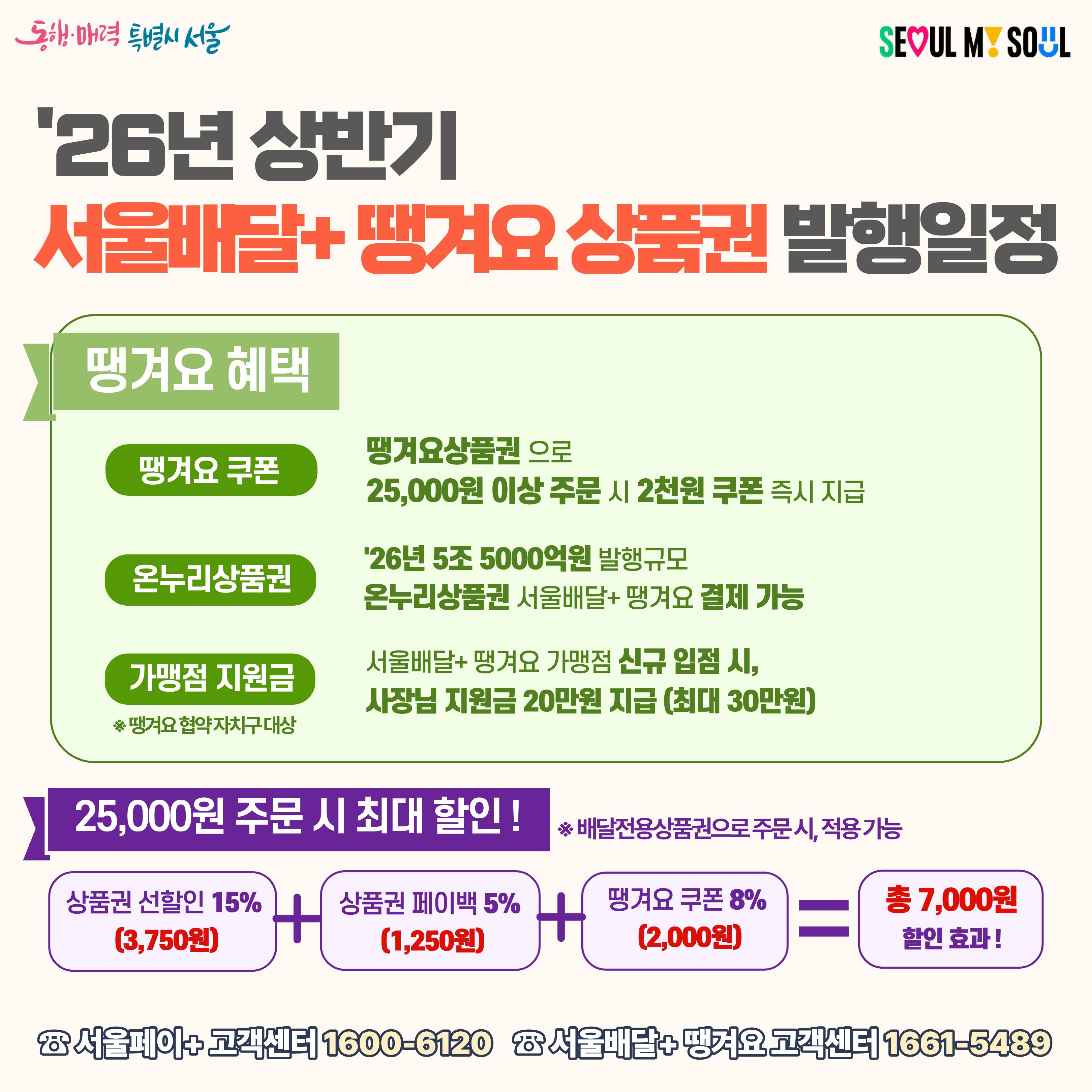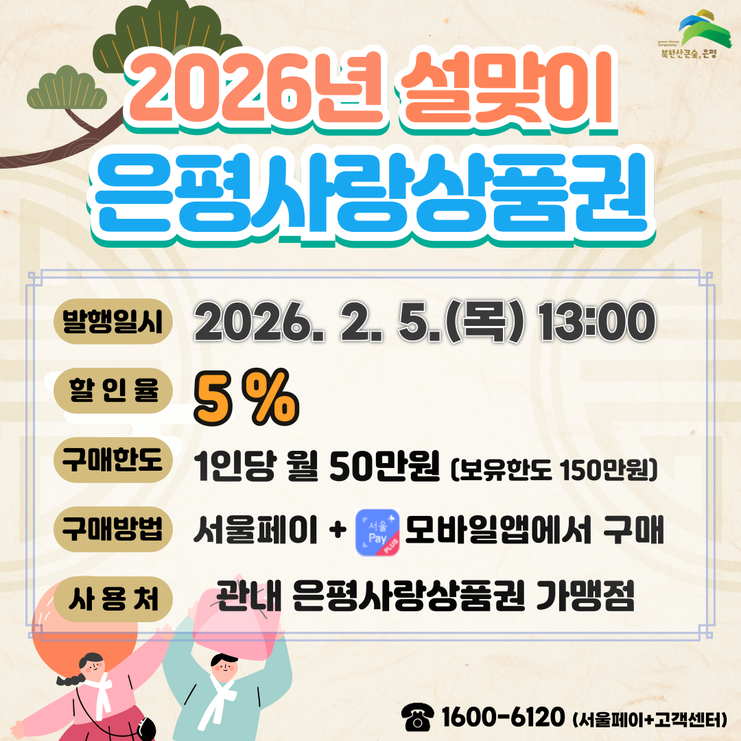 - 발행일시 : 2026. 2. 3.(화) 10:00 - 할 인 율 : 15% - 구매한도 : 1인당 월 20만원 (보유한도 100만원) - 사 용 처 : 은평구 소재 배달앱 땡겨요 가맹점 ○ 상품권명 : 은평사랑상품권 - 발행일시 : 2026. 2. 5.(목) 13:00 - 할 인 율 : 5% - 구매한도 : 1인당 월 50만원 (보유한도 150만원) - 사 용 처 : 관내 은평사랑상품권 가맹점 ○ 구매방법 : 서울페이+ 앱에서 구매 ○ 문 의 처 : 1600-6120(서울페이+ 고객센터) 또는 1661-5489(서울배달+고객센터)