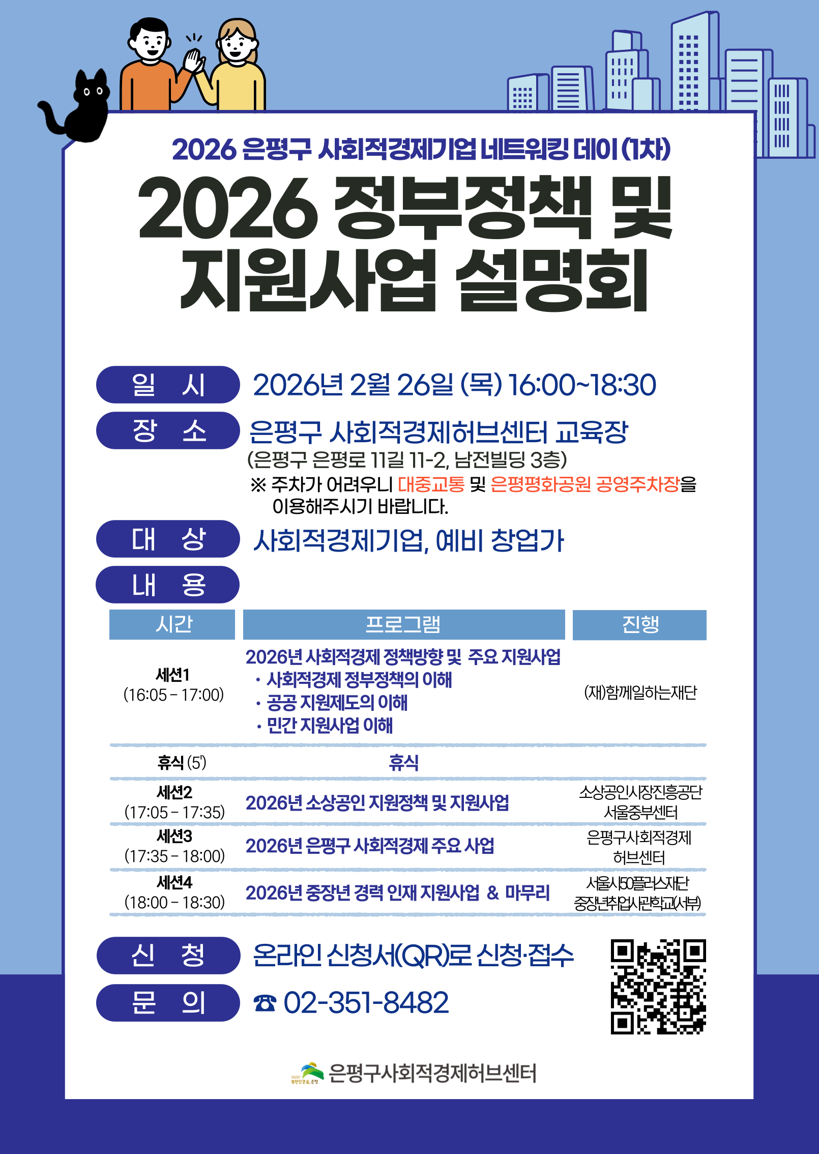 이번 설명회는 정부 정책 방향부터 소상공인 지원사업, 은평구 주요 사업까지 기업 운영에 필수적인 로드맵을 함께 설계하는 자리입니다. 정보 공유와 협력의 기회가 될 이번 행사에 관내 사회적경제기업인 분들의 많은 관심과 참여를 부탁드립니다. ■ 행사 개요 ㅇ 일시 : 2026년 2월 26일 (목) 16:00 ~ 18:30 ㅇ 장소 : 은평구 사회적경제허브센터 교육장 (은평로 11길 11-2, 남전빌딩 3층) https://naver.me/5D8Yafp0 ※ 주차가 어려우니 대중교통 및 은평평화공원 공영주차장 이용을 부탁드립니다. ㅇ 대상 : 사회적경제기업인, 예비 창업가 ■ 신청 안내 ㅇ 신청기한 : 2026년 2월 25일 (수)까지 ㅇ 신청방법 : 온라인 접수 ㅇ 신청링크 : https://forms.gle/wBwysmvLEGe4D1ccA ■ 유의사항 ㅇ원활한 진행을 위해 행사 시작 10분 전까지 입장을 완료해 주시기 바랍니다. ㅇ지구를 살리는 작은 실천! 개인 컵(텀블러) 지참을 부탁드립니다. ■ 문의 : 은평구 사회적경제허브센터 ☎ 02-351-8482