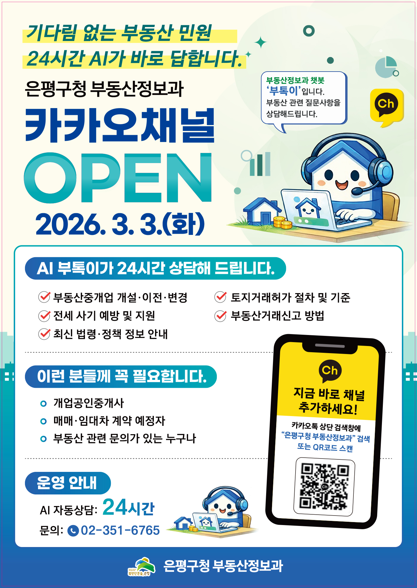「부동산 민원 AI 상담 서비스」를 구축하고 은평구청 부동산정보과 카카오채널을 개설하여 운영합니다. 이제 시간과 장소에 관계없이 언제든지 부동산 상담을 받아보실 수 있습니다. ✅ 주요 서비스 내용 🔹 부동산 민원 24시간 AI 자동상담 🔹 전세사기 예방 및 피해 상담 🔹 부동산중개업 개설·이전·변경 절차 상담 🔹 토지거래계약허가 신청 절차 및 기준 상담 🔹 부동산거래신고(주택임대차신고) 방법 상담 🔹 최신 부동산 정책·법령 정보 제공 📱 이용 방법 ① 카카오톡 상단 검색창에 👉 “은평구청 부동산정보과” 검색 → 채널 추가 후 상담 메뉴 선택 ② QR코드 스캔 후 채널 추가 상담 메뉴 선택 👥 이런 분들께 도움이 됩니다 - 개업공인중개사 - 매매·임대차 계약 예정자 - 부동산 관련 문의가 있는 누구나 📞 문의 : 은평구청 부동산정보과 ☎ 02-351-6765